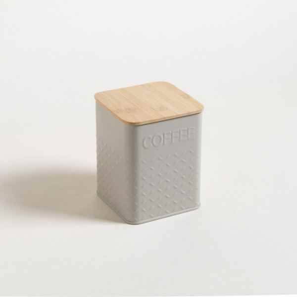 Lata de acero galvanizado color gris con tapa de bamboo.