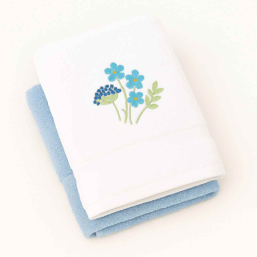 Agrega un toque de frescura y color para tu baño. 💐🩵(1 Toalla de rostro liviana bordada, diseño ramillete + 1 Toalla de rostro liviana lisa en color celeste)