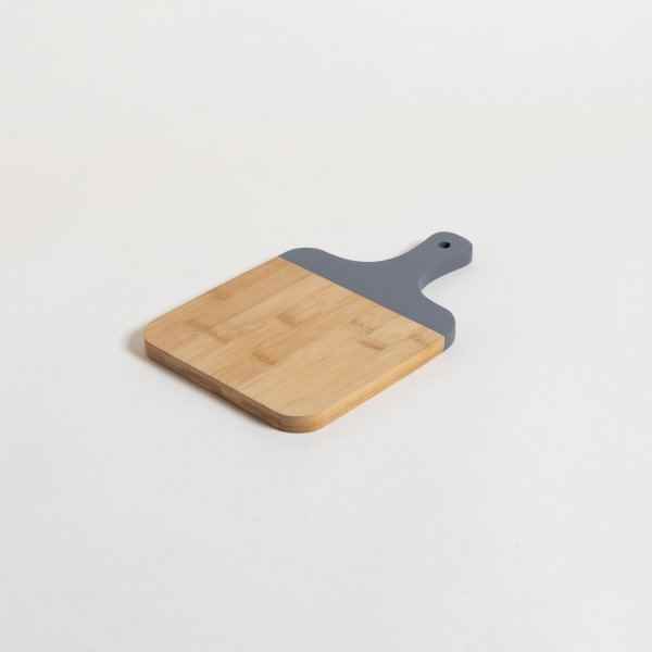 Tabla de madera rectangular con mango y borde pintado en color gris.Características:· Medidas: 28 x 18 cm· Material: Madera de Bamboo· Apto Lavavajillas: No. Apto Microondas: No. Origen: China